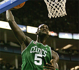 Kevin Maurice Garnett (born May 19, 1976 in Mauldin, South Carolina) is an American professional basketball player for the NBA's Boston Celtics. The 6 ft 11 in (2.11 m), 220 lb (100 kg/16 st) power forward[1] is regarded as one of the best all-around players in NBA history. His accomplishments include being voted Most Valuable Player of the 2003-04 season, NBA Defensive Player of the Year of the 2007-08 season, being named to eleven All-Star teams and being named to eight All-NBA and All-Defensive Teams.[2] He is also the all-time leader in NBA seasons played with averages of at least 20 points, 10 rebounds, and 5 assists per game.